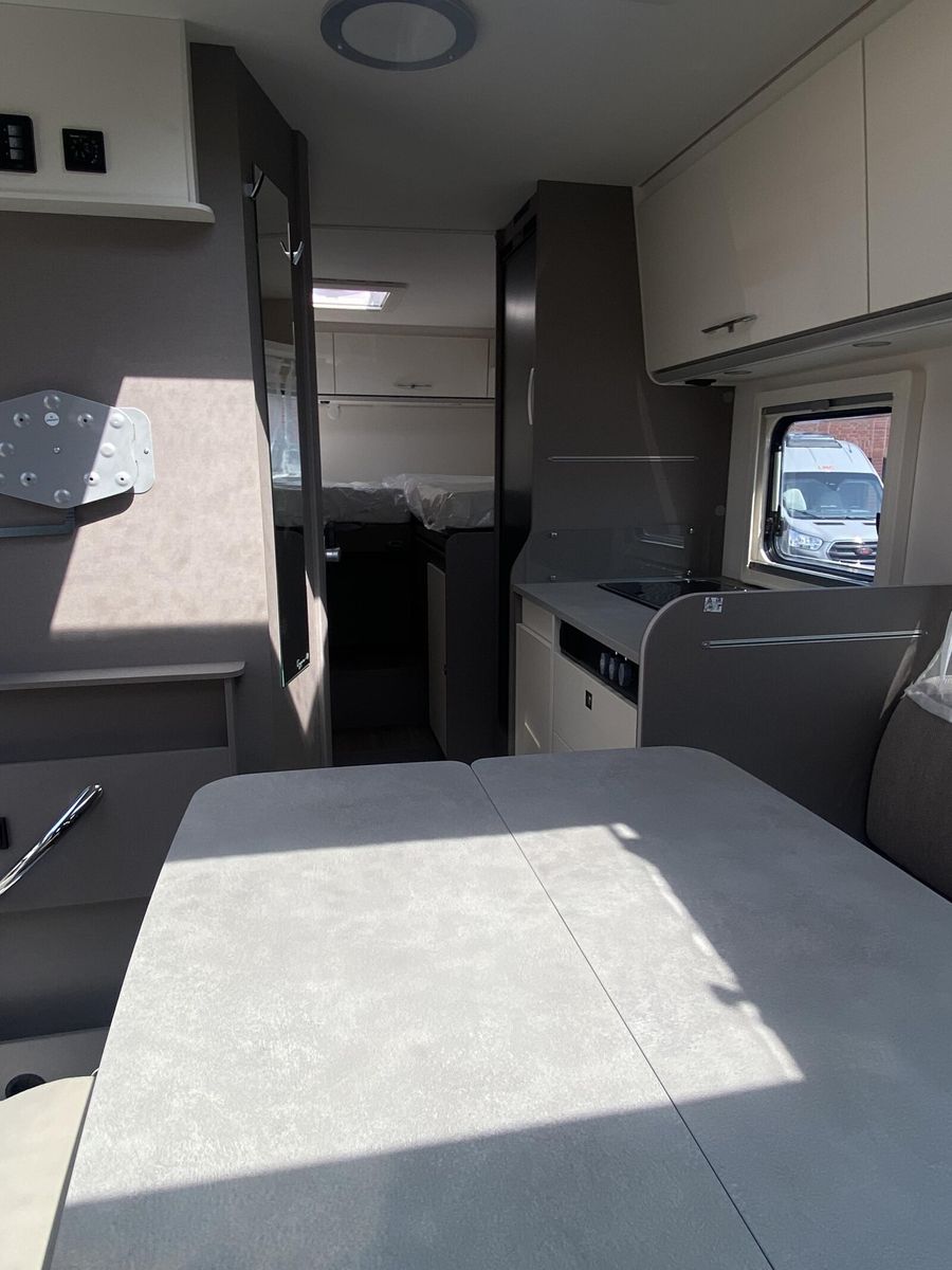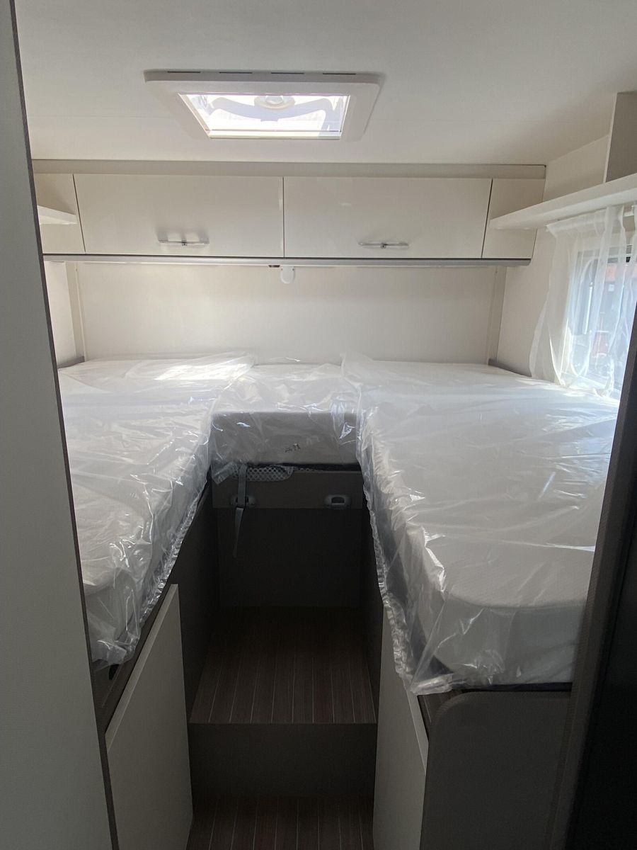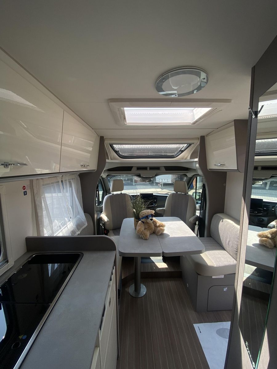 Modell 2025 Motor / Chassis: Ford Transit 2,0l TDCi Leistung: 121 kW / 165 PS Getriebe: Automatik zul. Gesamtgewicht: 3500 kg Bett(en): Einzelbetten Polster: Emilia (Type X) Holzdekor: Magnolia (type X)
