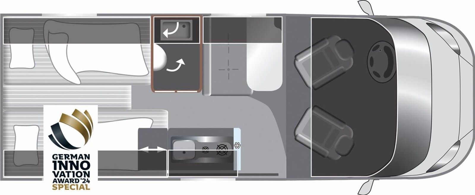 Modell 2026 Motor / Chassis: Ford Transit Leistung: 121 kW / 165 PS Getriebe: Automatik zul. Gesamtgewicht: 3500 kg Bett(en): Einzelbetten