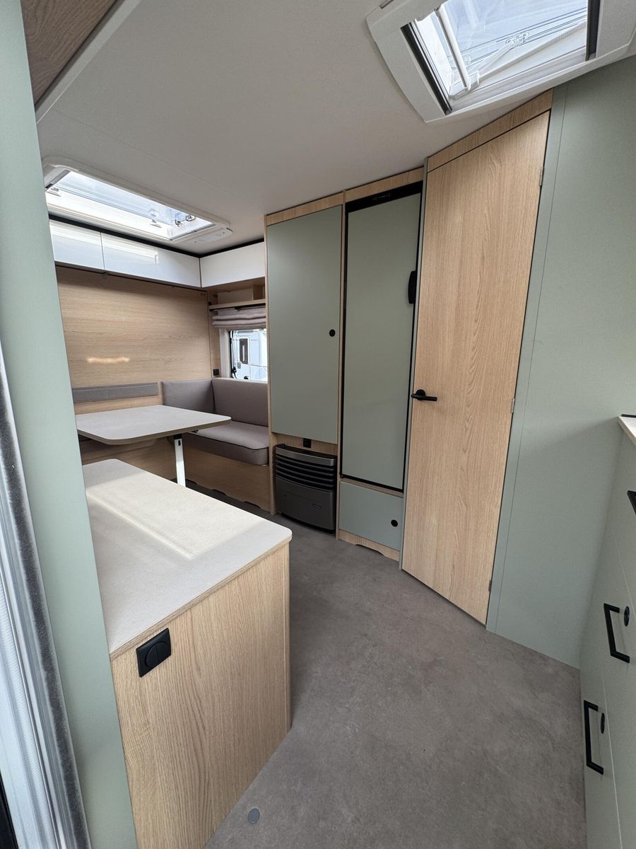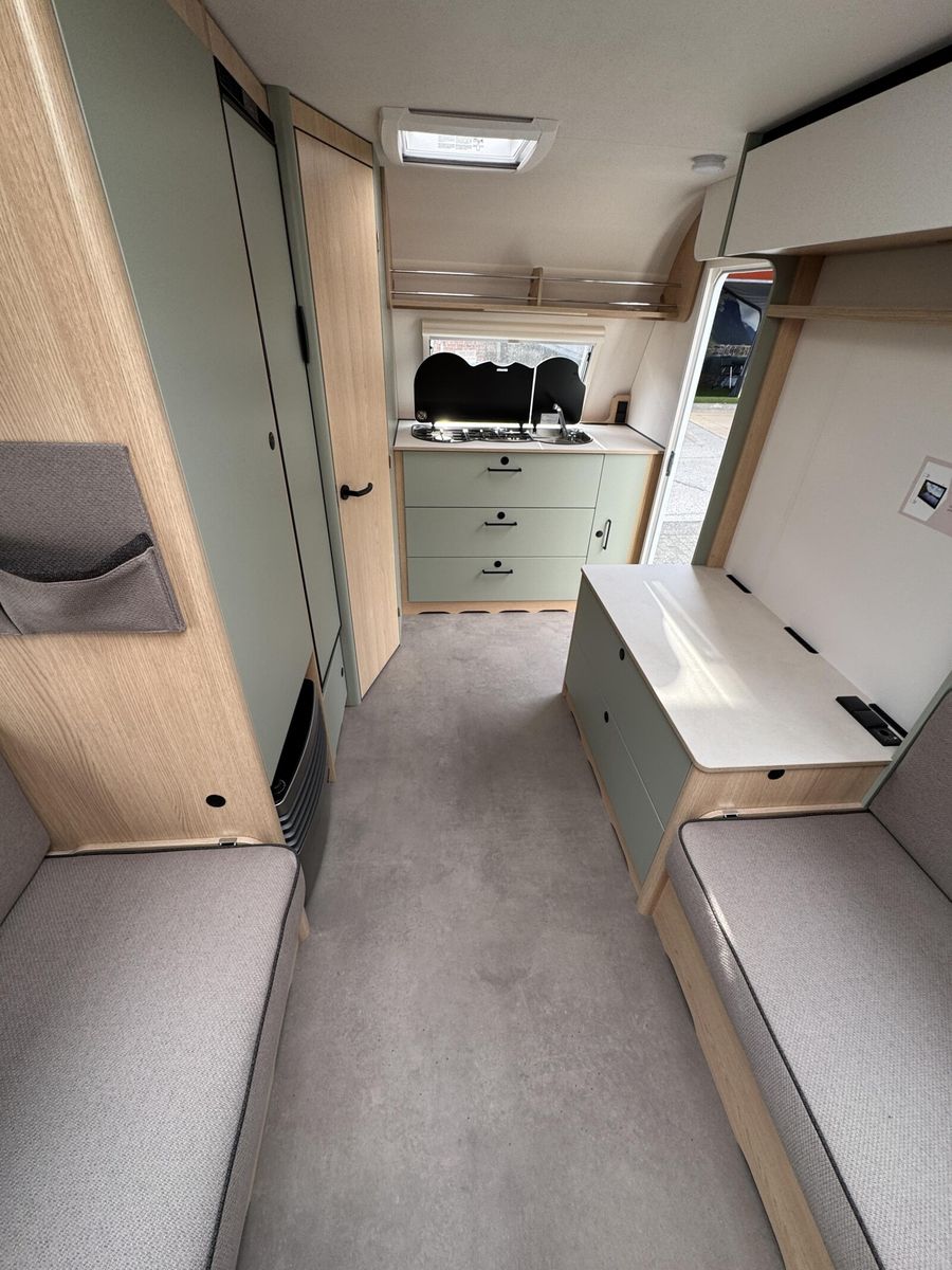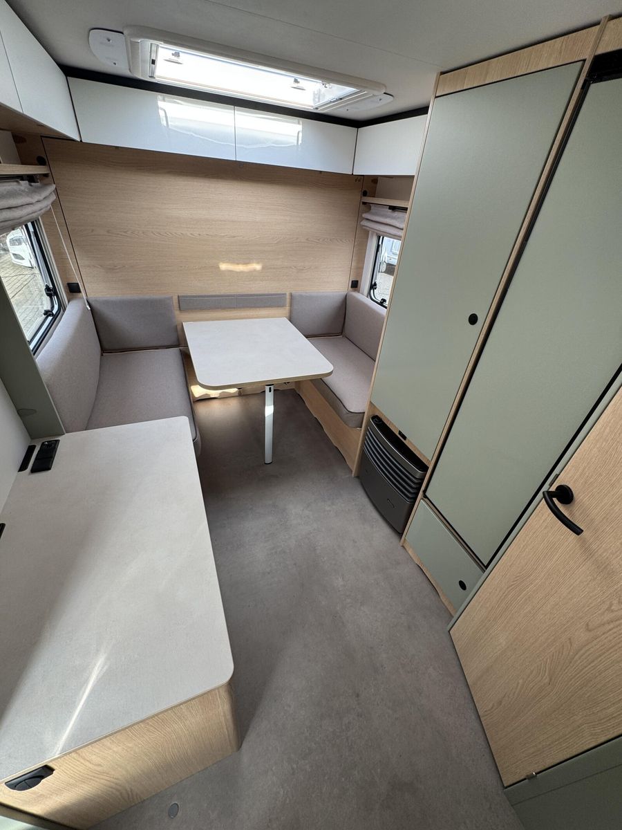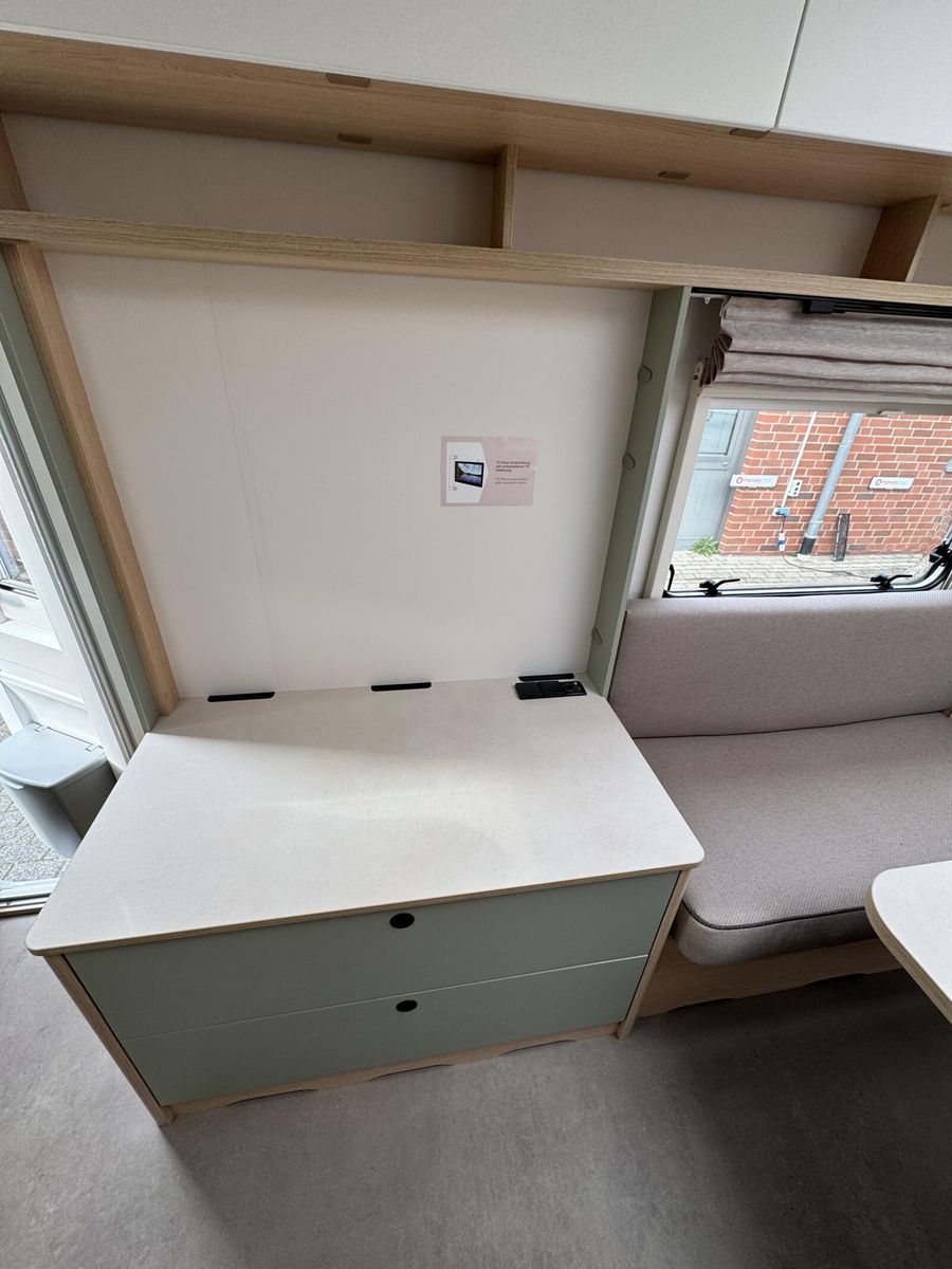 • Style Paket (TV-Vorbereitung (1x12V Steckdose, 2x Antennenkabel SAT/TV), Reserveradhalterung im Flaschenkasten, Insektenschutztür in Aufbautür, LED-Ambientebeleuchtung, Therme für Warmwasserversorgung 5 l (Warmwassermischbatterie enthalten), Umluftanlage für Gasheizung, Eingangstür mit Fenster inkl. Verdunklungsrollo, einteilig inkl. Abfalleimer, Abwassertank 25 l rollbar, Frischwassertankanzeige, 2x USB-Steckdose für Stromschiene, Vorbereitung für Klimaanlage inkl. Dachverstärkung, Stützrad mit Stützlastanzeige, Stabilformstützen inkl. Tellerfüßen, Deichselabdeckung, Vorzeltleuchte LED, Dachhaube Klarglas 960x650mm mit Baldachin und Beleuchtung über der Sitzgruppe inkl. Verdunklungsrollo und Insektenschutz)